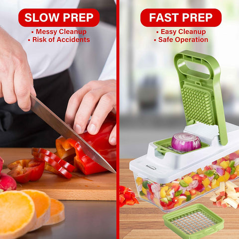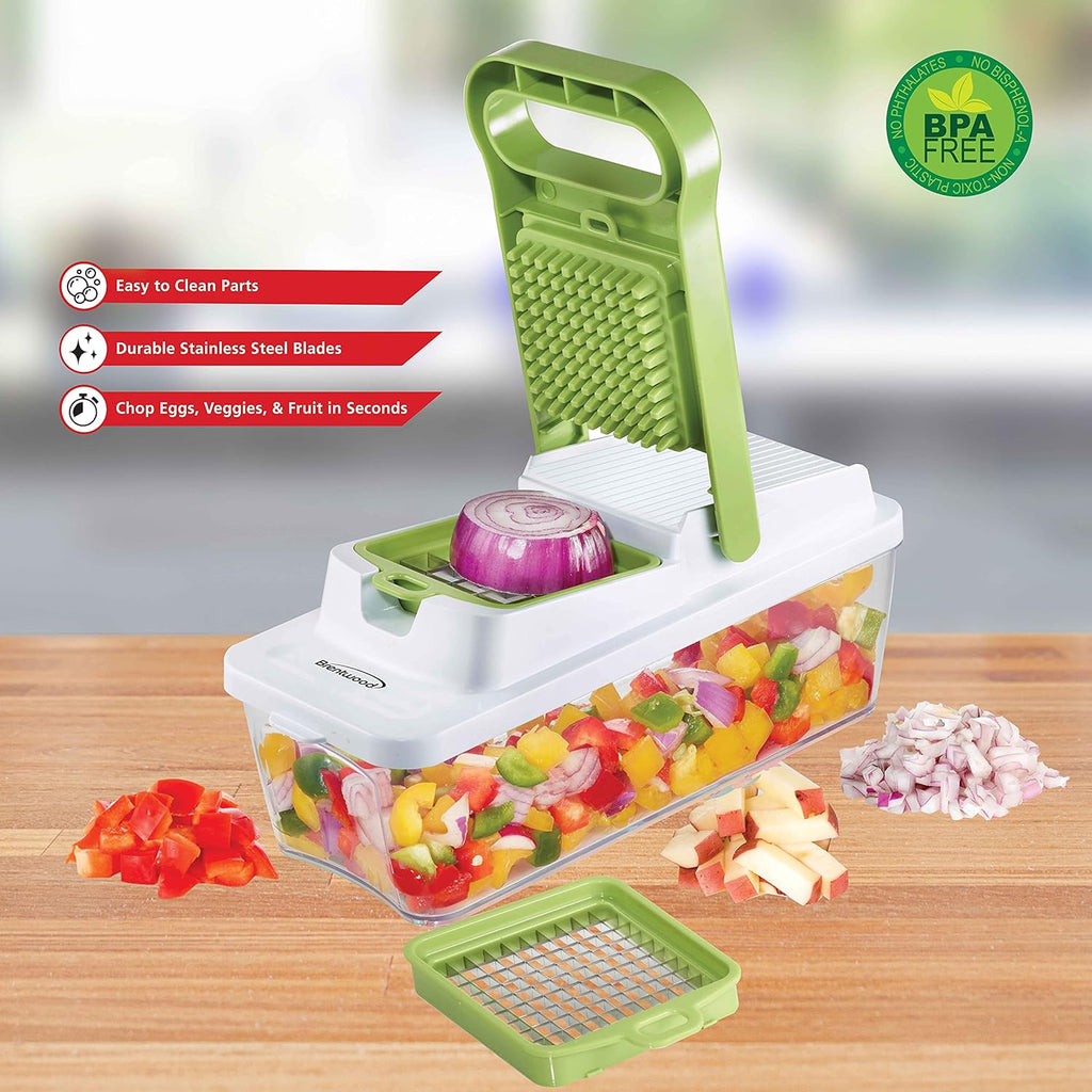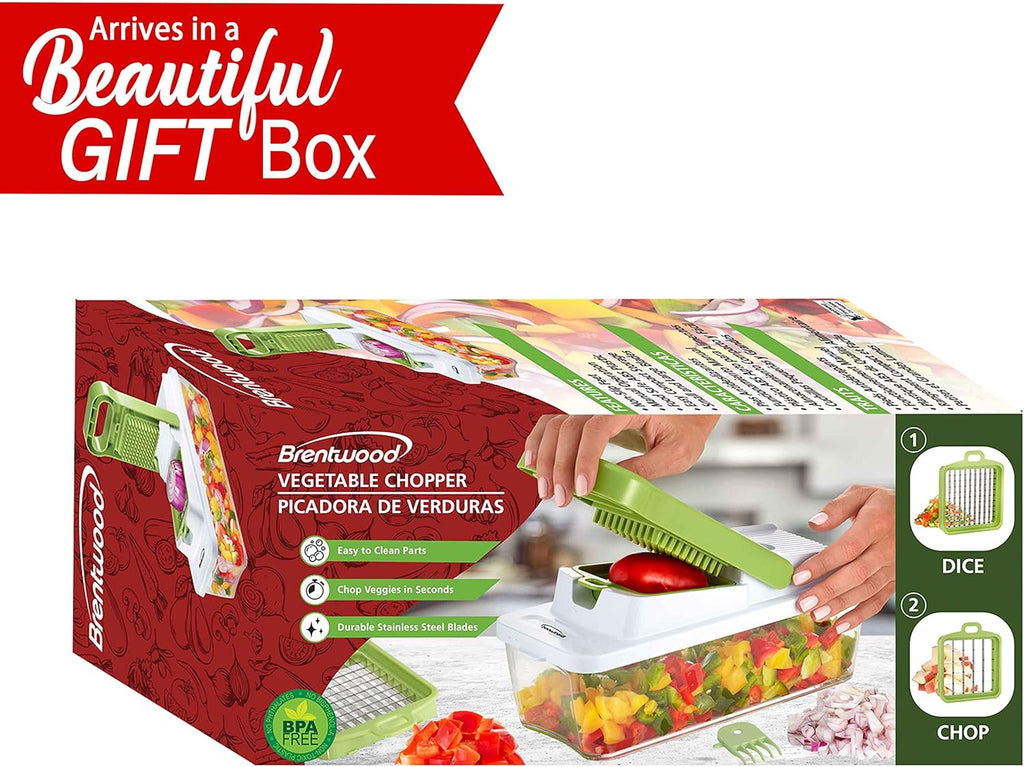 Use the Brentwood Food Chopper and Vegetable Dicer for effortless food prep. Chopped food falls right into the 6.75-cup storage container. It comes with stainless steel blades and has a cleaning comb for easy cleanup.