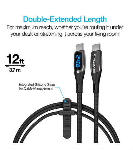 No more guessing games. With a built-in LED digital wattage meter display, the DigiWATT Cable from Naztech lets you clearly monitor exactly how much power your device draws while it charges. For the absolute ultimate universal compatibility, this USB-C cable supports Power Delivery charging up to the maximum 240-watt level – so you can plug in and visibly fast charge any and all USB-C devices, from low-power headphones to high-power laptops, and everything in-between. It's built with industrial-strength braided cotton and polished zinc alloy connector housings for 20x the durability of standard cables. It also includes an integrated silicone strap for easy cable management on the go.