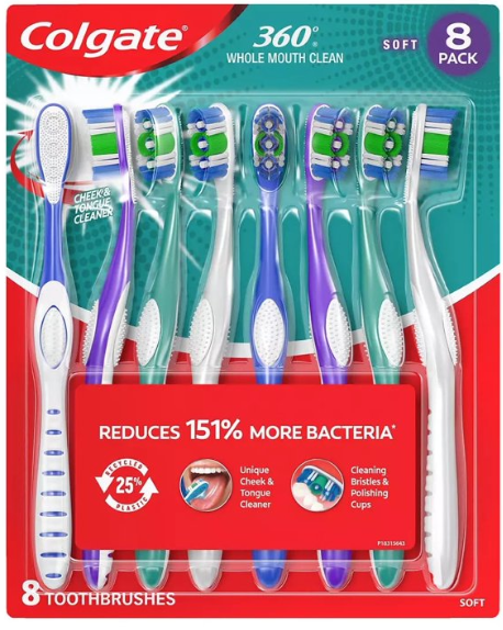Helps reduce 151% more bacteria.Polishing cups help remove stains.Removes bacteria from teeth, tongue, cheeks and gums.Cheek and tongue cleaner cleans your whole mouth while you brush.Comfortable, ergonomic handle for precise maneuvering.- The Colgate 360 Whole Mouth Clean adult toothbrush is designed with cleaning bristles and polishing cups that help remove more plaque and stains than an ordinary flat-trim toothbrush. This toothbrush has a unique cheek and tongue cleaner that helps reduce 151% more bacteria* from your mouth.Product Features:The toothbrush reduces 151% more bacteria (bacteria that cause bad breath vs. brushing teeth alone with an ordinary flat-trim toothbrush)Cleaning bristles and polishing cups help remove more plaque and stains vs. an ordinary toothbrushThe adult manual toothbrush is designed to reach all areas of your mouthA cheek and tongue cleaner helps to remove odor causing bacteriaAn ergonomic handle design provides precise maneuvering when brushingIncludes toothbrush multi-pack, 8 pk.*Bacteria that cause bad breath vs. brushing teeth alone with an ordinary flat-trim toothbrush.